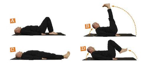 Versione alternativa. Nel caso risulti difficile alzare e abbassare le gambe distese, il rito può essere effettuato partendo dalla posizione iniziale con le ginocchia piegate (C): in questo modo la colonna vertebrale viene meno sollecitata (D).