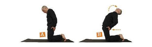 In ginocchio, mani posizionate sui glutei, piedi in appoggio sulle dita flesse e in contatto con il suolo, testa appoggiata sullo sterno (A). Inarcare all'indietro testa, spalle e il tratto toracico della schiena (B). Inspirare quando si inarca ed espirare mentre si ritorna alla posizione di partenza. Durante il rito mantenere rilassate le mascelle.