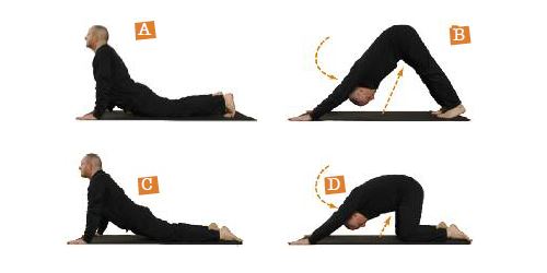 Proni, bacino e arti sfiorano terra, testa eretta, palme delle mani appoggiate a terra larghe quanto le spalle e piedi appoggiati sulle dita flesse larghe quanto le anche (A), sollevare il bacino, espirando (B). Inspirare tornando alla posizione di partenza.